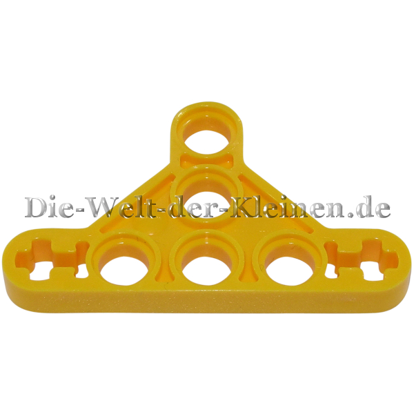 Yellow LEGOTechnic Liftarm Triangle 3x5 flat (1/3) Typ II with 5 Pin holes / Round holes and 2 Cross holes / axle holes